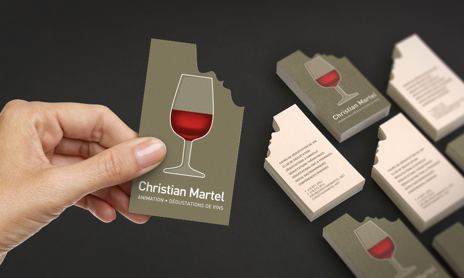 Depuis près de 30 ans, Christian Martel agit à titre de conseiller et d’expert en vin. Il anime des Clubs de dégustation et offre des cours de dégustation de vin au grand public. Voici une carte d’affaires des plus originales. Un visuel simple et épuré sur une carte comportant la découpe d’un profil de visage, positionné à la façon d’un expert voulant apprécier les arômes d’un bon vin.