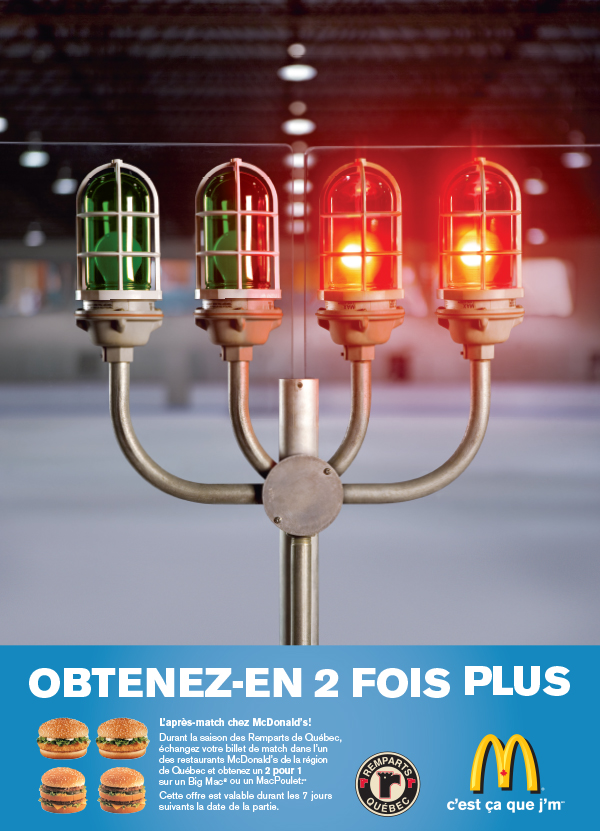 Restaurants McDonald’s Affiche Description du mandat Promotion conjointe avec les Remparts de Québec. Sur présentation du billet d’un match des Remparts, obtenez un 2 pour 1 sur le Big-Mac ou le MacPoulet. Moyens de diffusion Affiche Photo : Pub Photo, Claude Mathieu