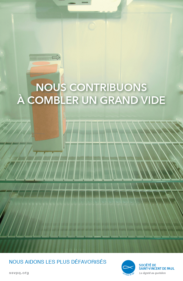 Société Saint-Vincent de Paul Affiche, TV Description du mandat Mettre en valeur la vocation première de l’organisme afin d’appuyer leurs efforts lors de campagnes de sensibilisation et d’activités de collecte de fonds. Moyens de diffusion Message TV et affiche